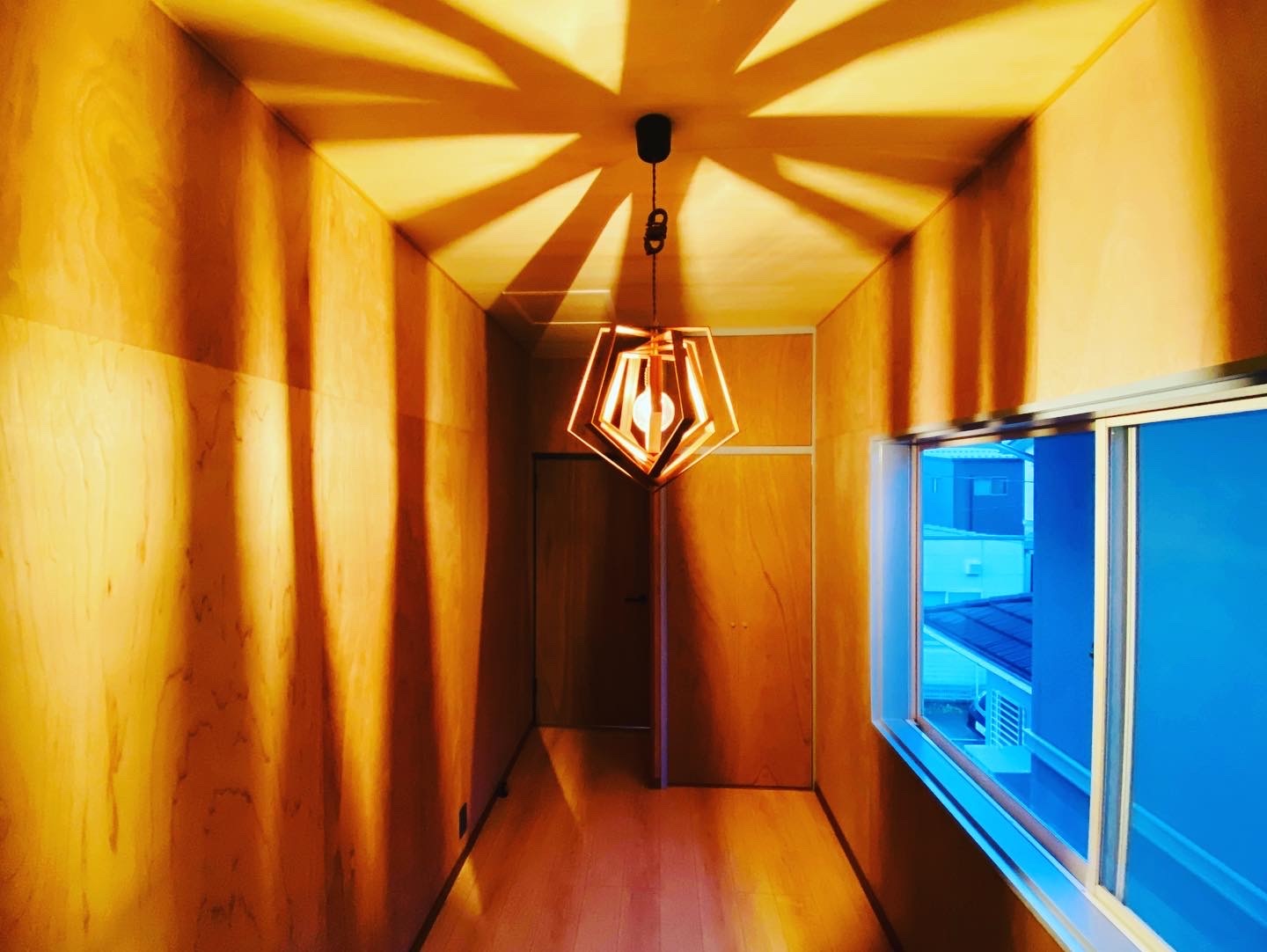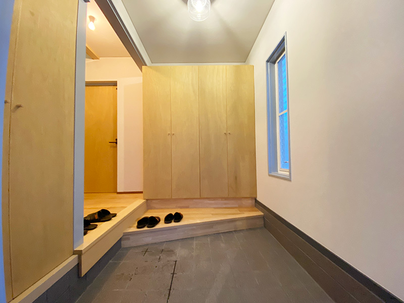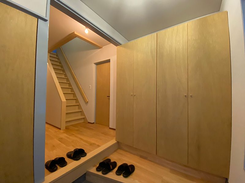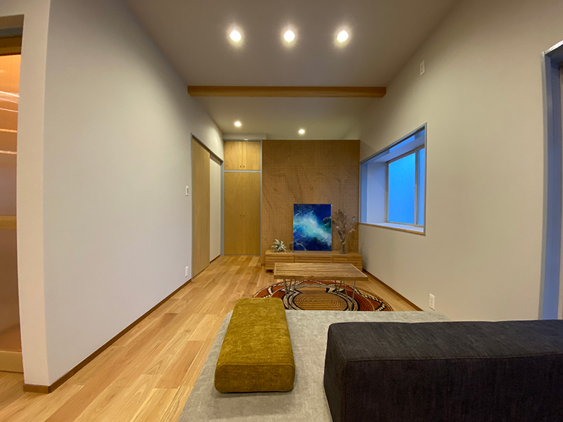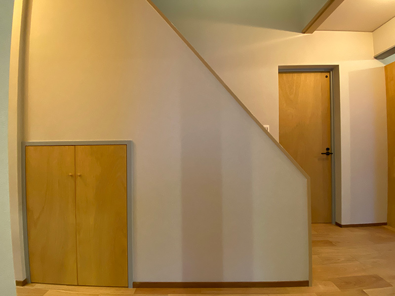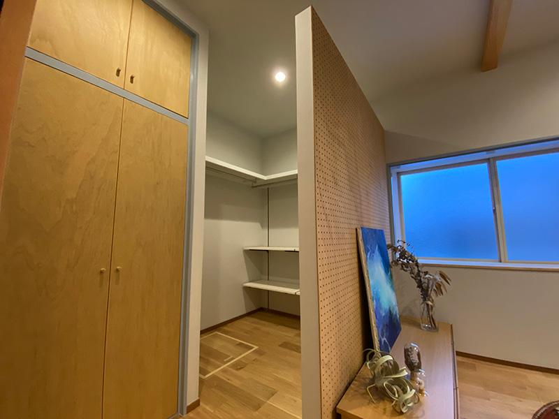 個人的に好きな空間はお部屋としても使える納戸スペースです、あえて壁紙を貼らずベニヤ仕上げが好い