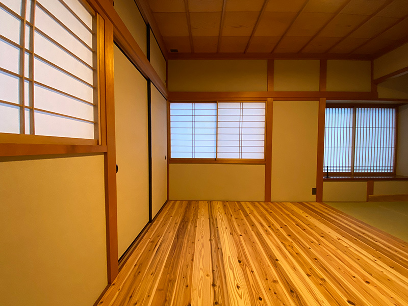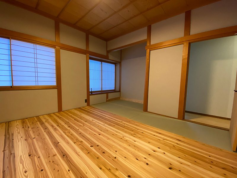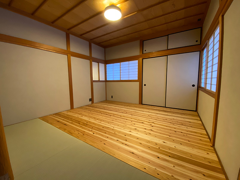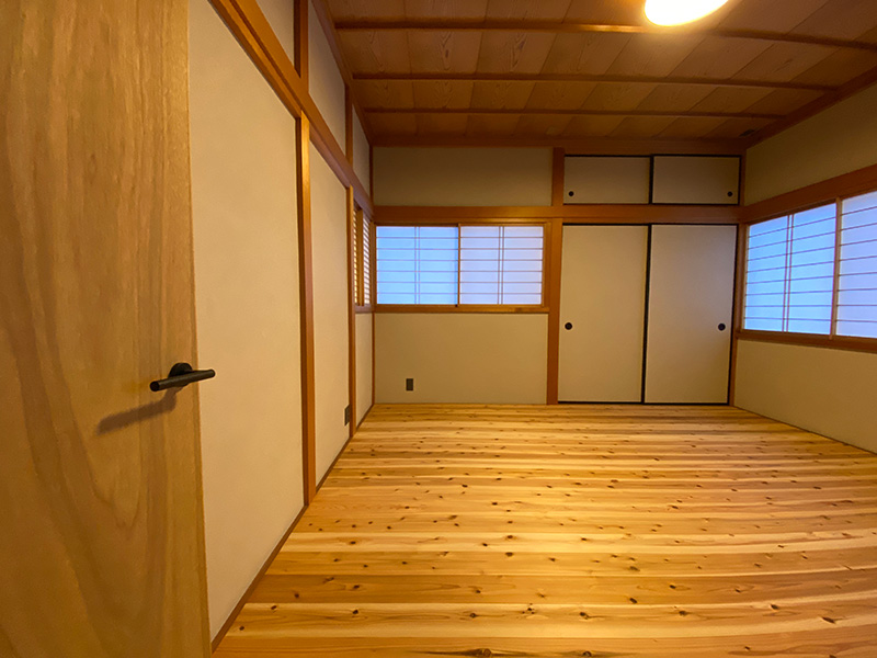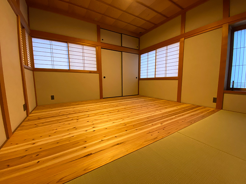 2階寝室は元々タタミのお部屋でしたが和の空間を生かすため無垢材フローリングで仕上げワークスペースをあえてタタミ仕上げ