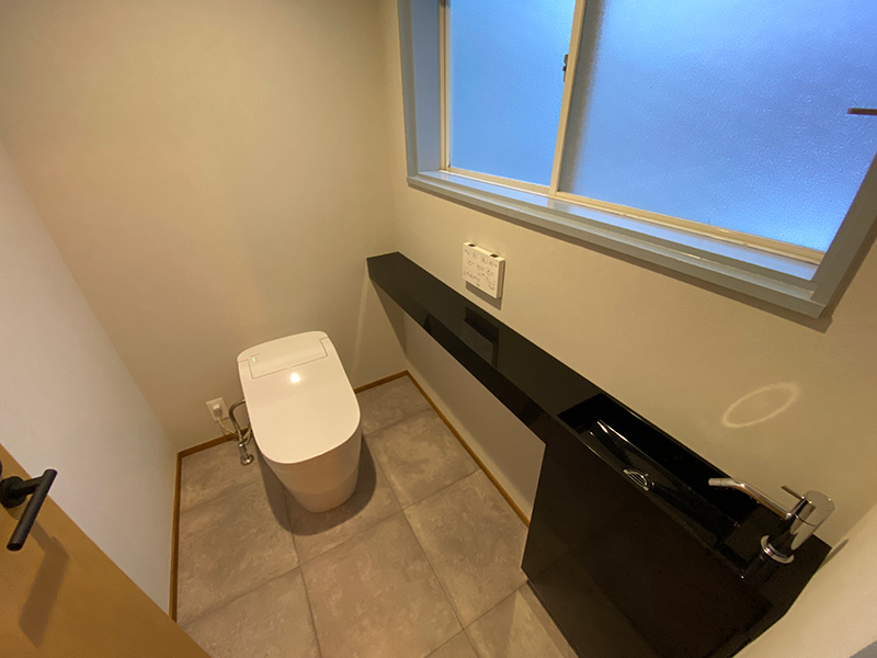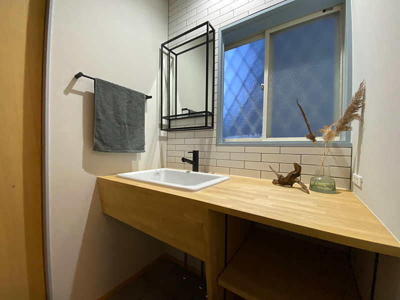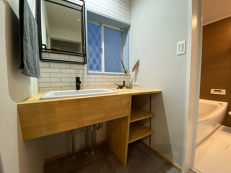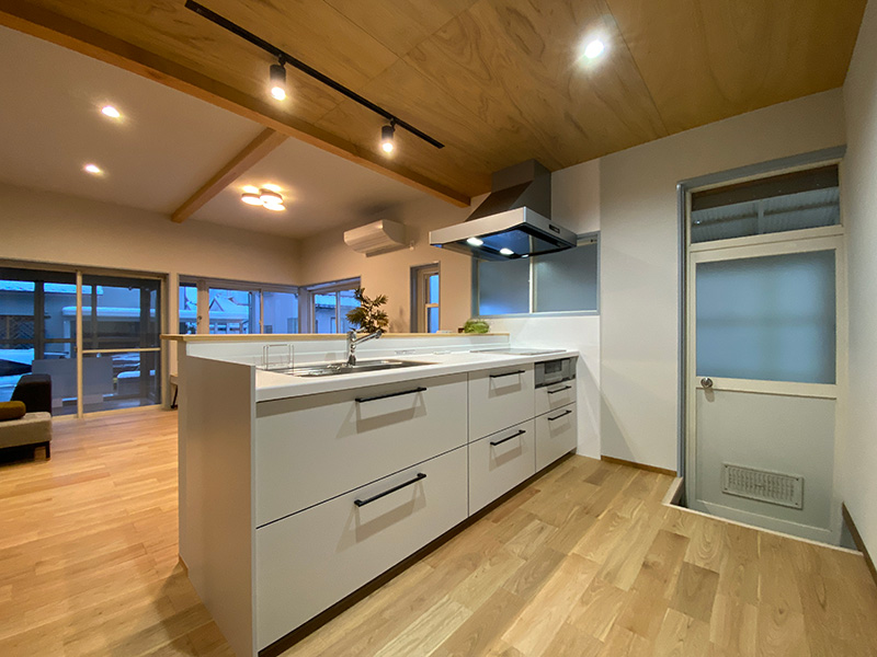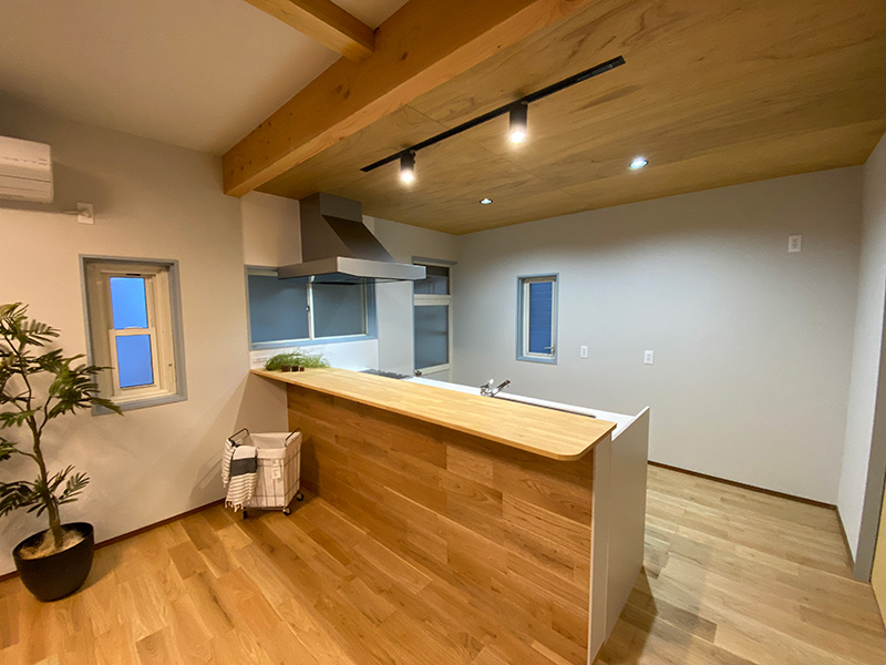 キッチンカウンター下部の腰壁は、椅子を配置して座った際に足が当たっても劣化しないようにフローリングの板をそのまま張り進めています。